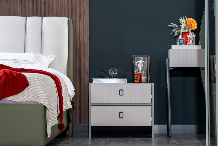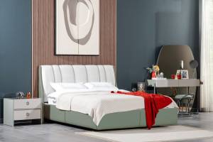 Patul este tapitat cu material textil in combinatie cu ecopiele verde sage.