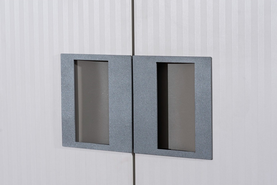 Sticla neagra pe frontul a 2 usi laterale de la dulap.