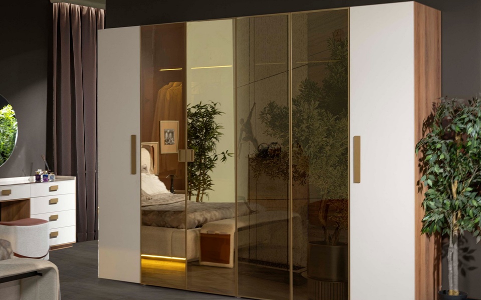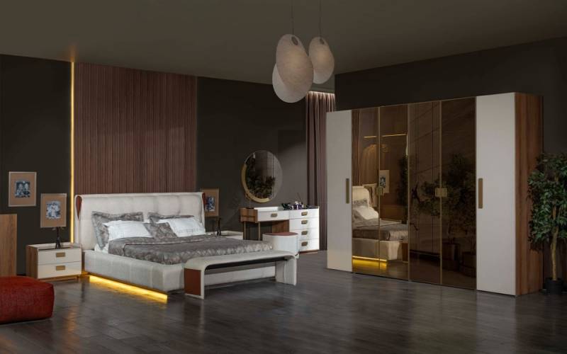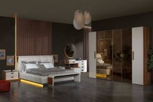 L MELISSA dormitor Varianta 1 (dulap 6 usi, pat 160, noptiere, comoda+oglinda, taburet