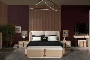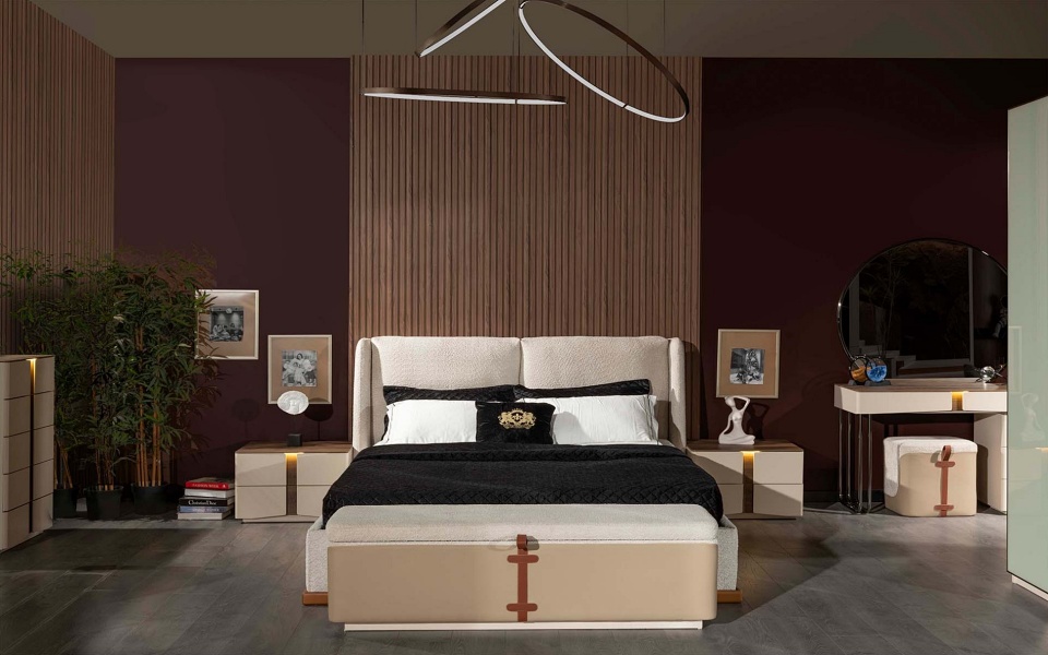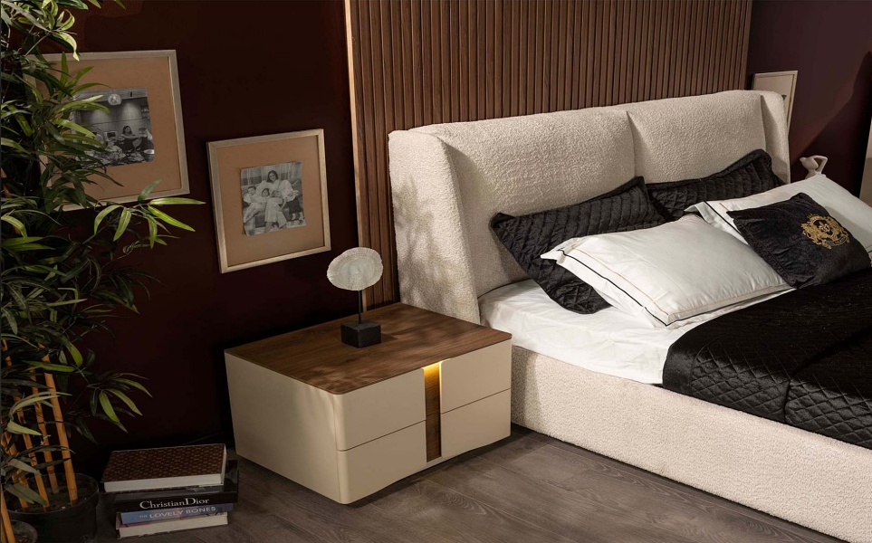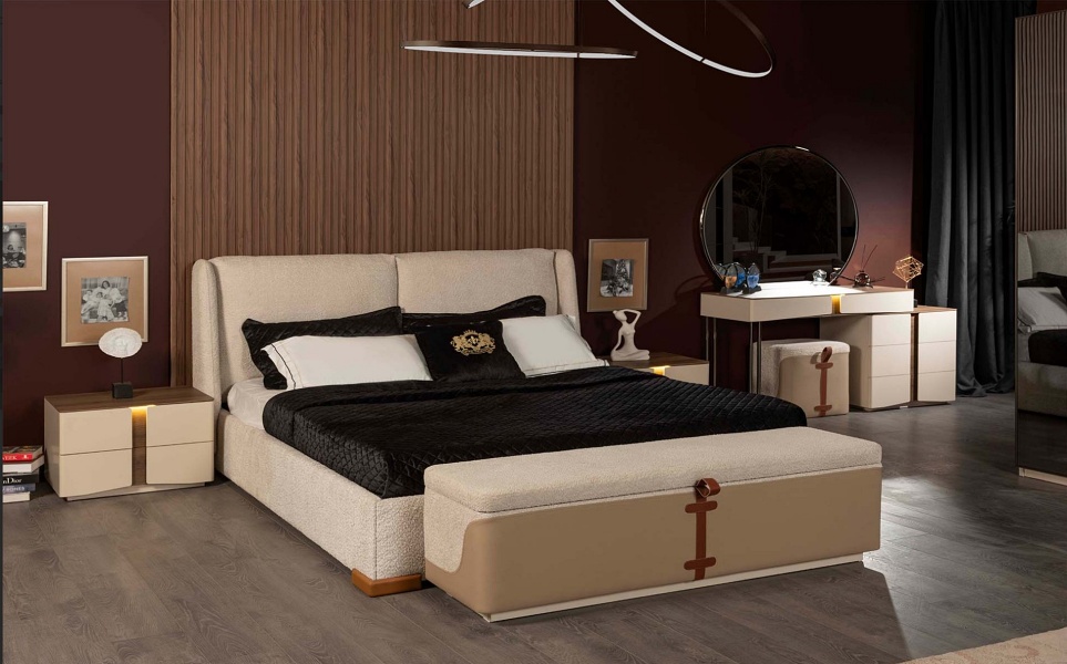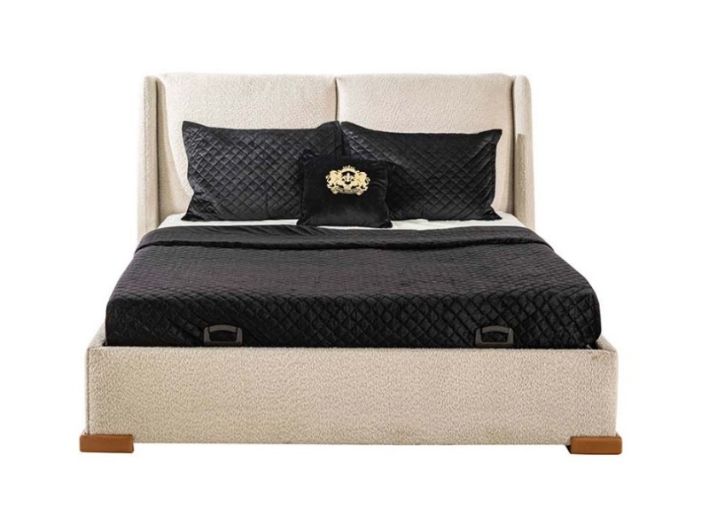 Patul este tapitat cu material textil in combinatie cu material textil crem