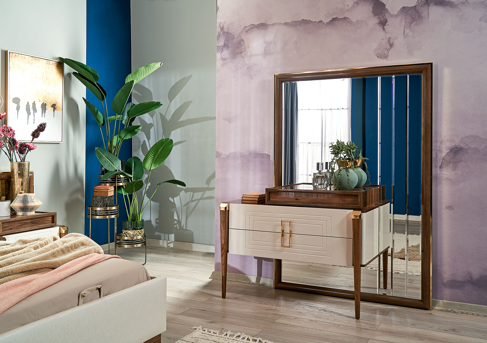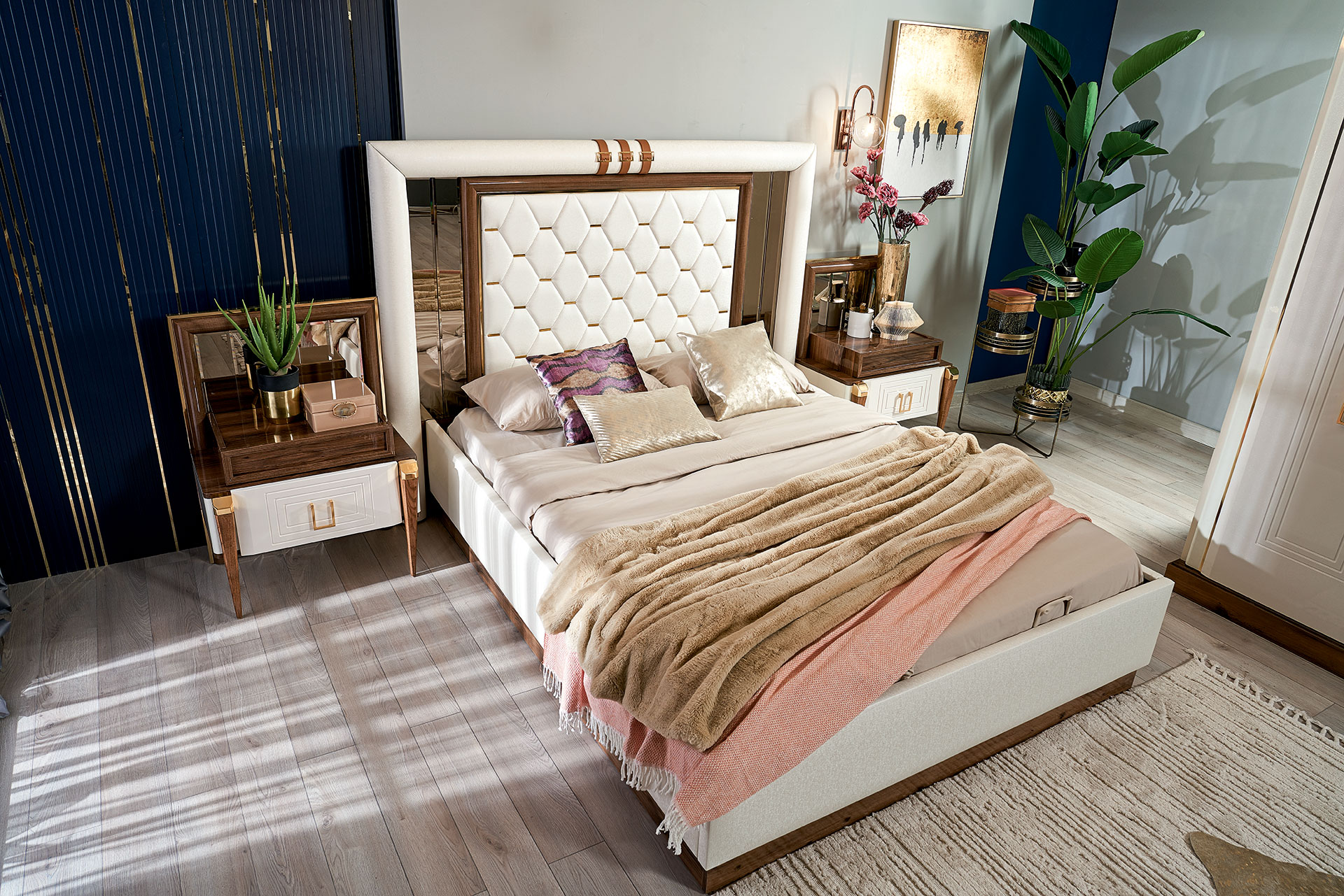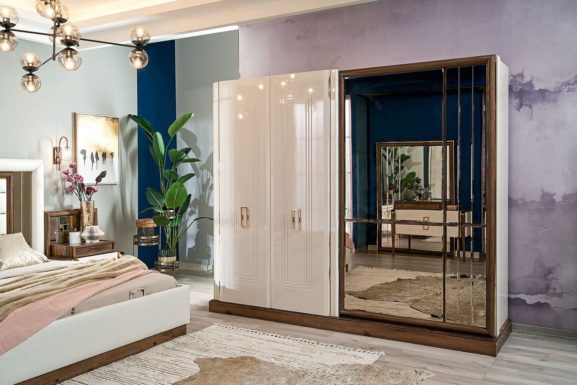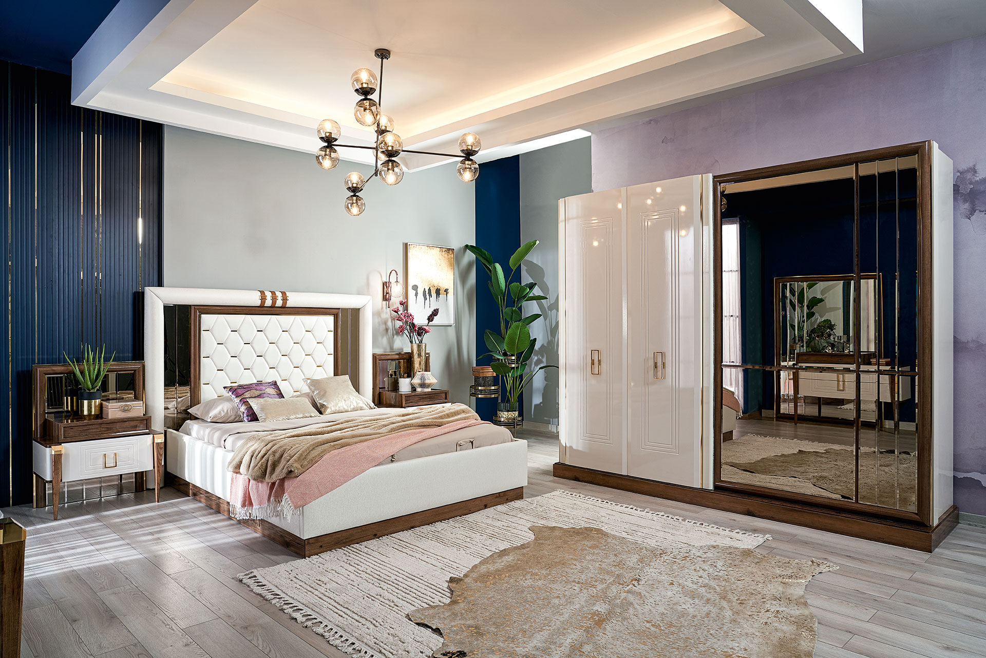 Setul contine: un dulap, un pat 160x200cm, o comoda + oglinda, 2 noptiere