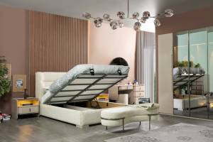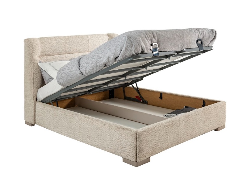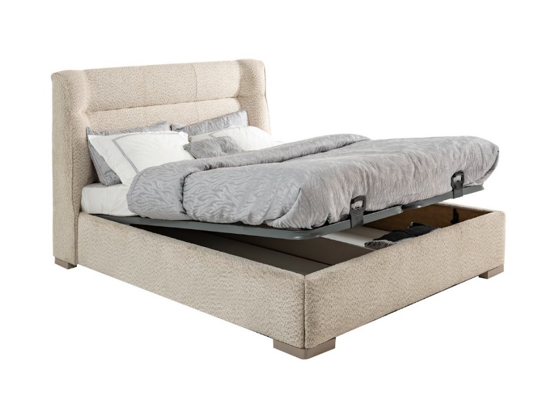 Patul este prevazut cu spatiu pentru depozitare tip lada si cu somiera (sistem de rabatare cu pistoane pe gaz)