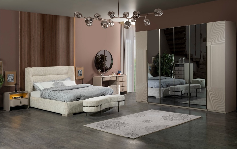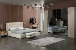 L PARIS dormitor Varianta 1 (dulap 6 usi, pat 180, noptiere, comoda+oglinda, taburet)