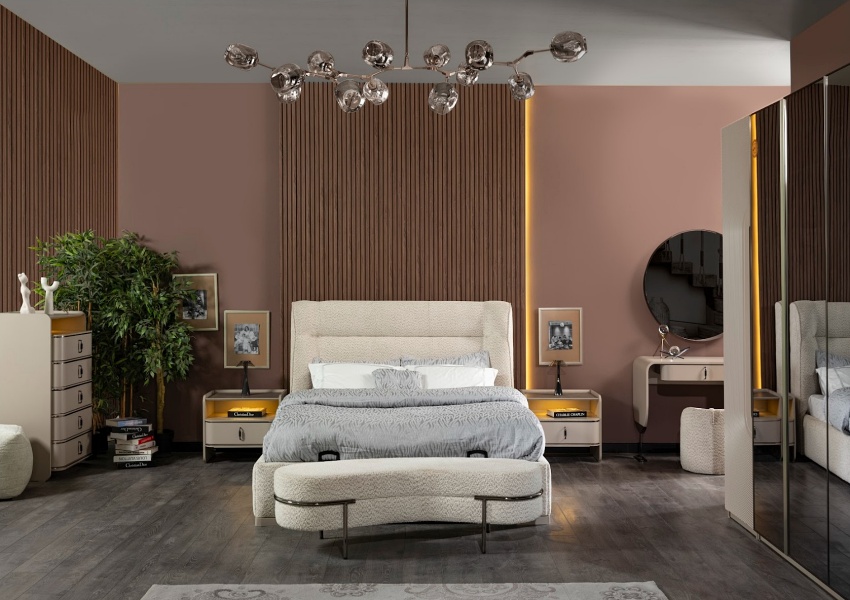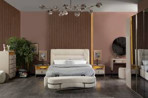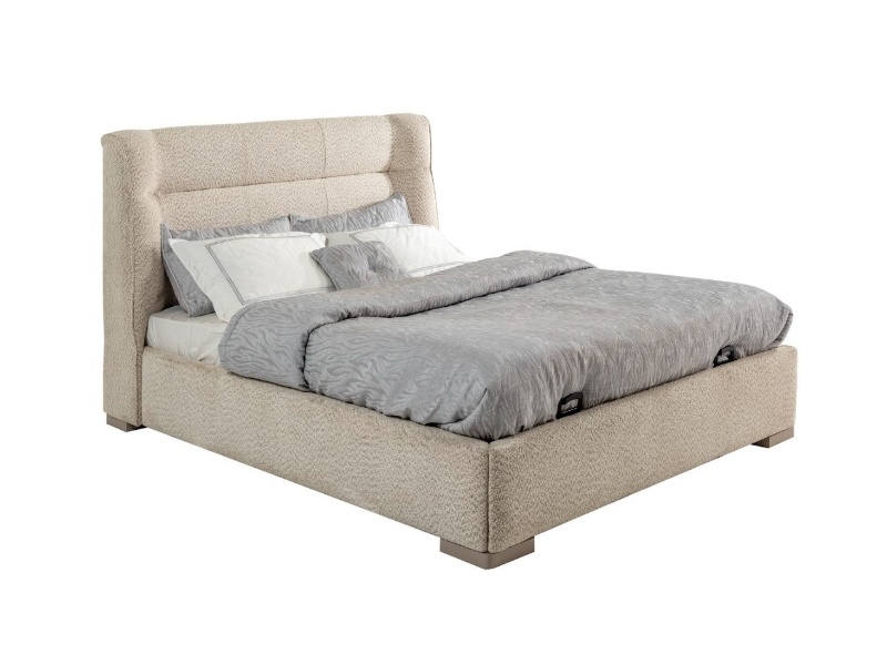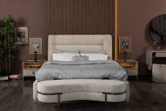 Patul este tapitat cu material textil crem.
