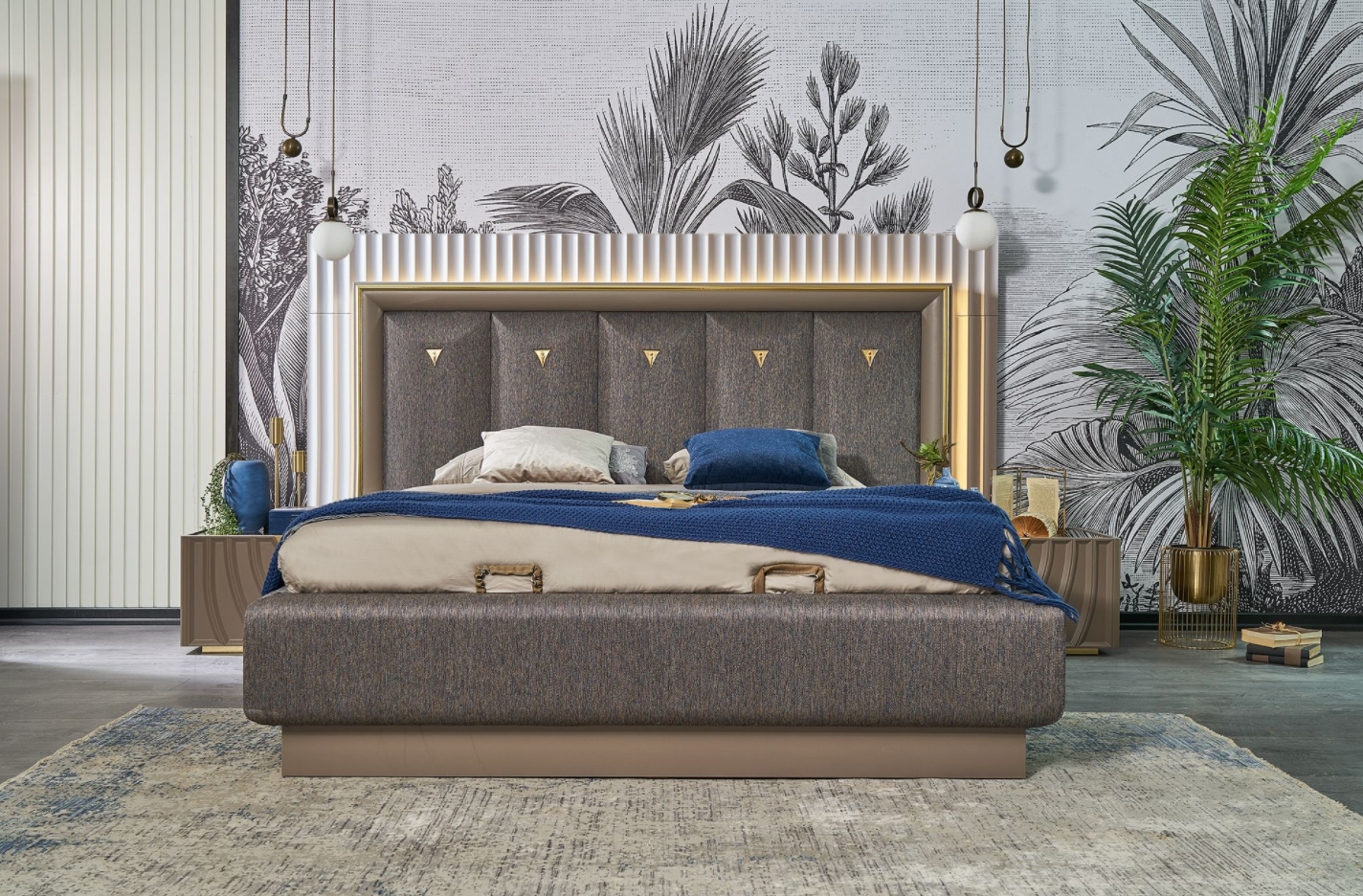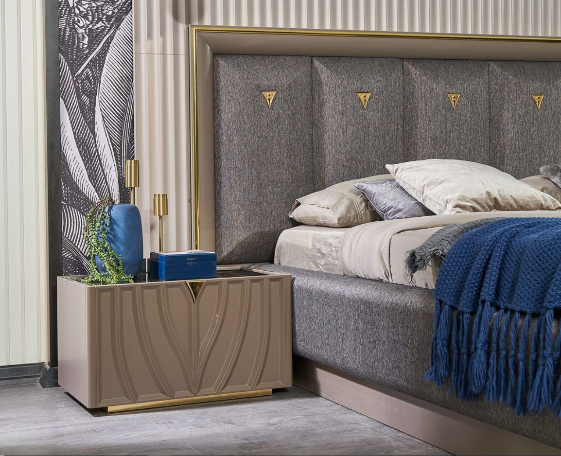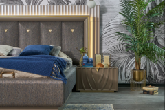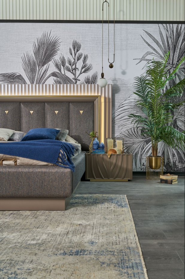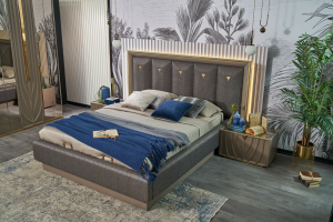 Patul este tapitat cu material textil.