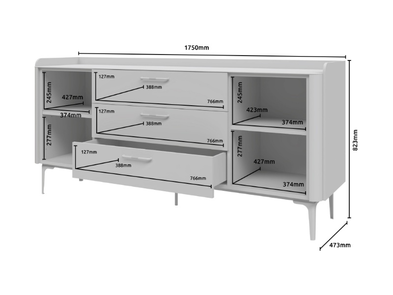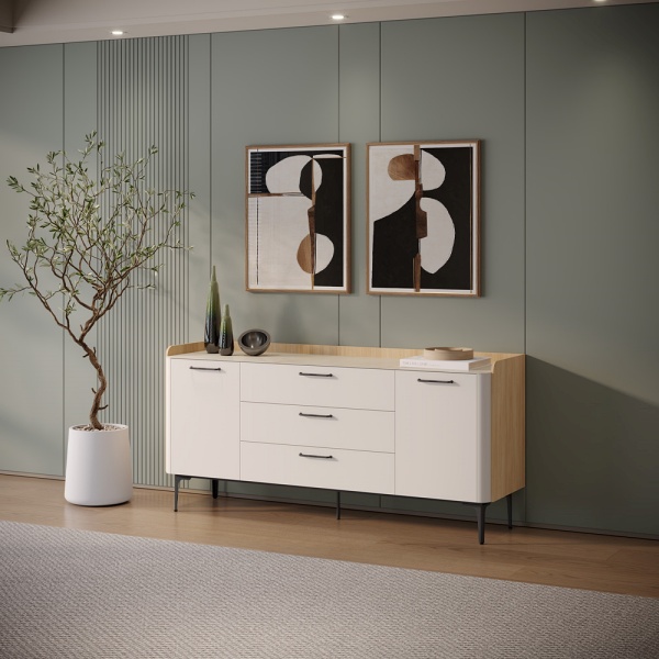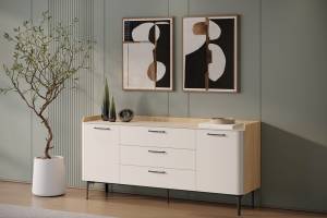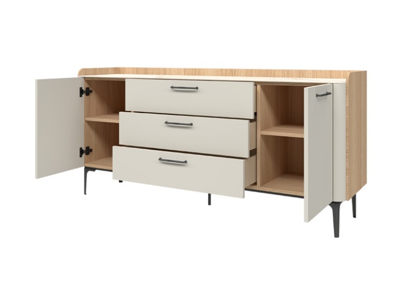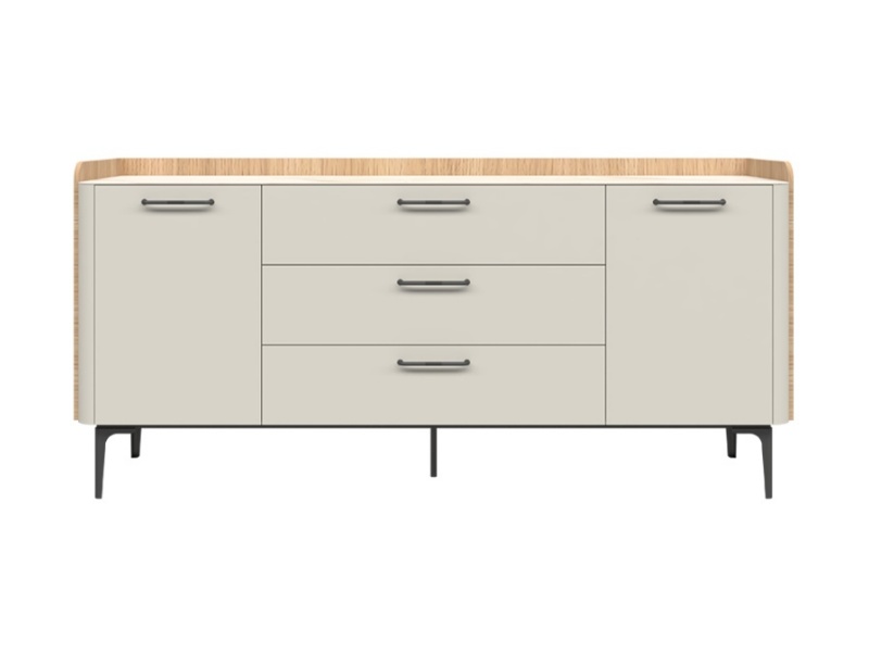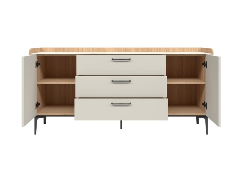 Comoda cu 2 usi si 3 sertare AIR 175x83x48cm Pepper White/ Stejar Furneo - sticla cu model de marmura Calcatta Oro, cadru, manere si picioare Antracit