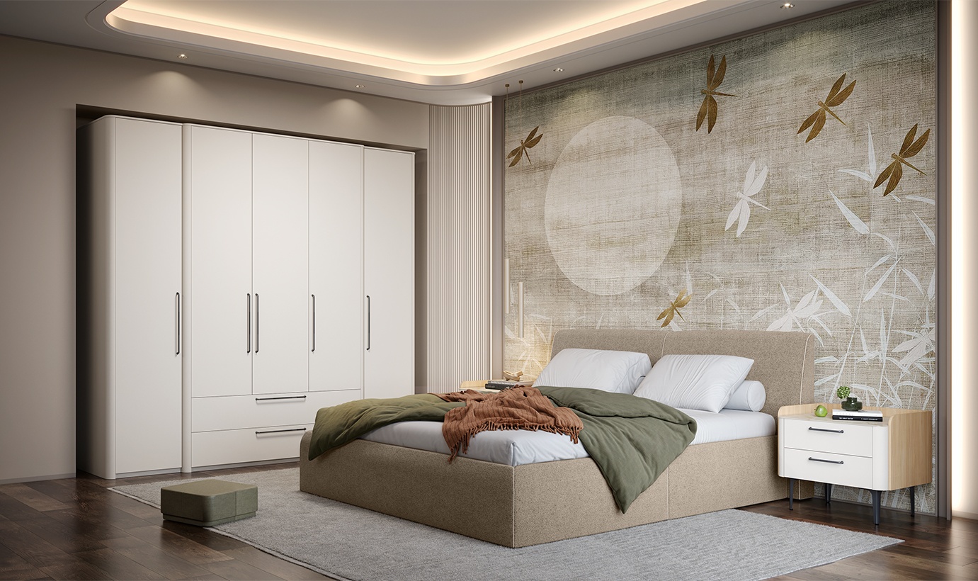 Pretul afisat nu include dulapul, noptierele, montajul, alte piese de mobilier si accesoriile din imaginea de prezentare a produsului.