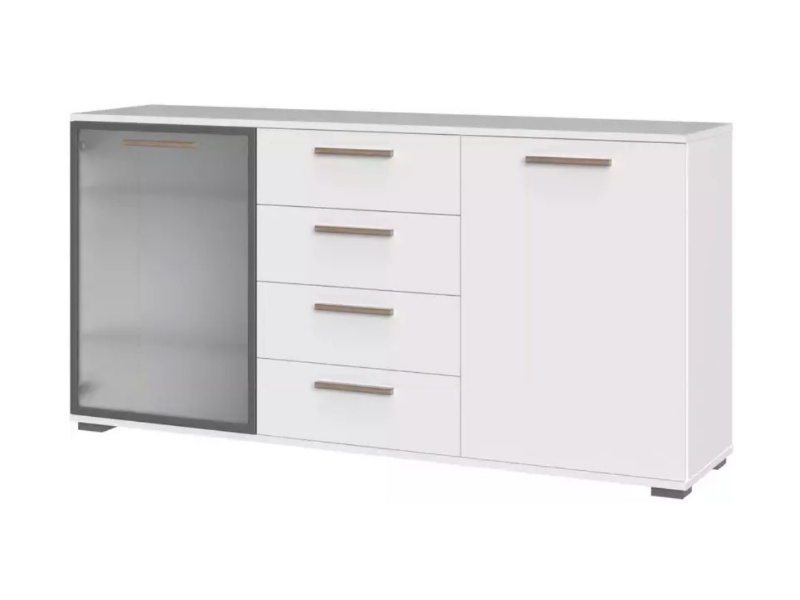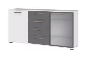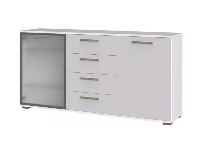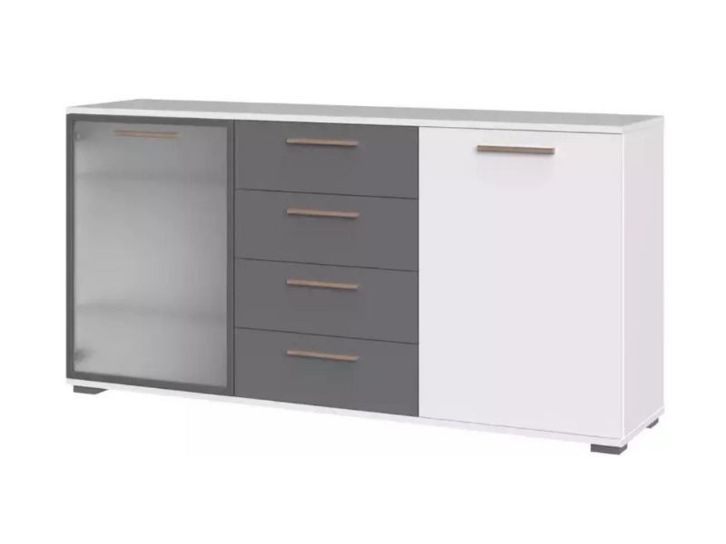 - comoda are 2 usi (1 usa decor grafit mat + 1 usa sticla sablata) + 4 sertare ( 2 sertare decor grafit mat + 2 sertare Nuc Pacific)