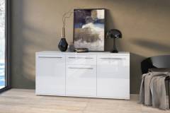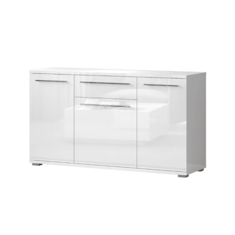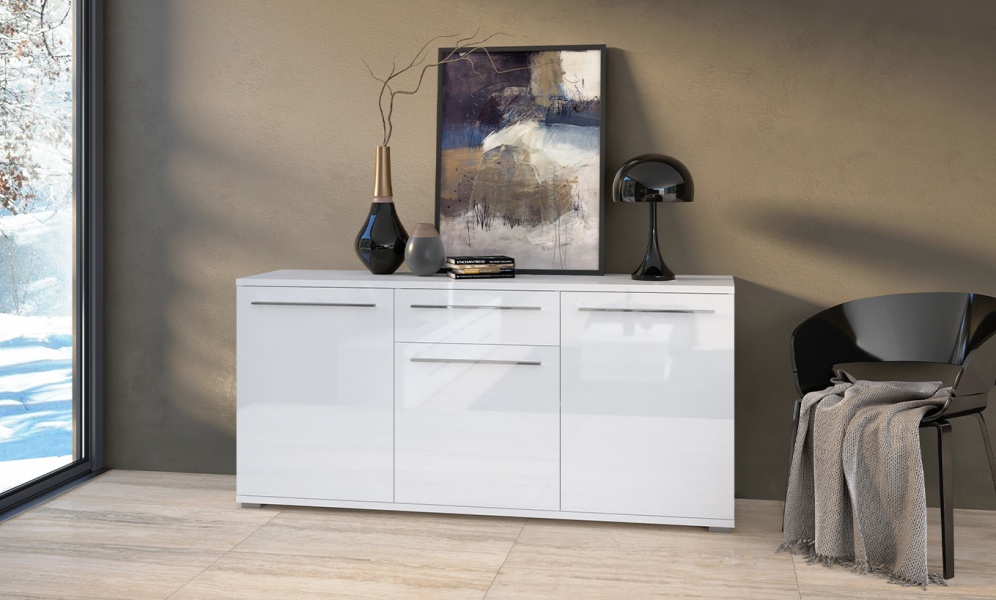 Comoda cu 3 usi si 1 sertar PIANO WHITE 150x85x45cm alb lucios, manere crom