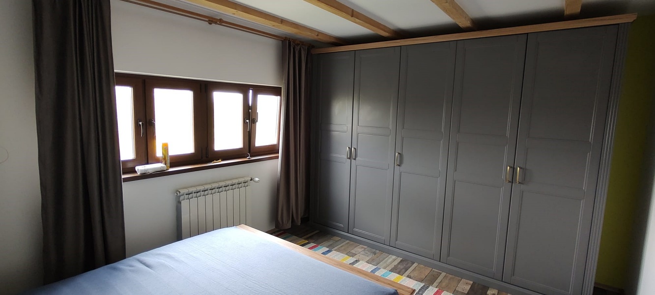 - interiorul dulapului este decorat cu lemn de nuc din Pacific și toate laturile vizibile sunt lăcuite cu lac UV cu un efect moale mat, nuanta grafit