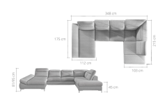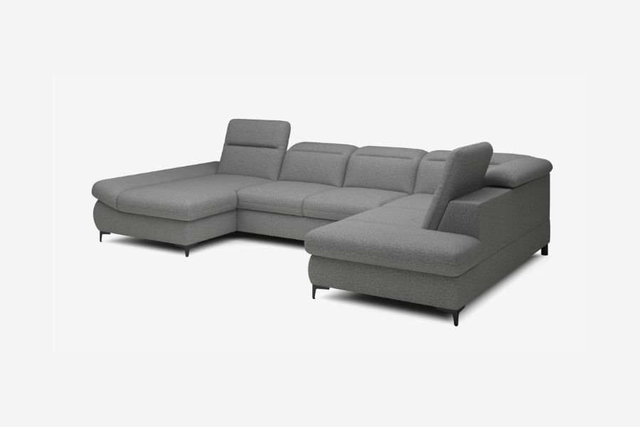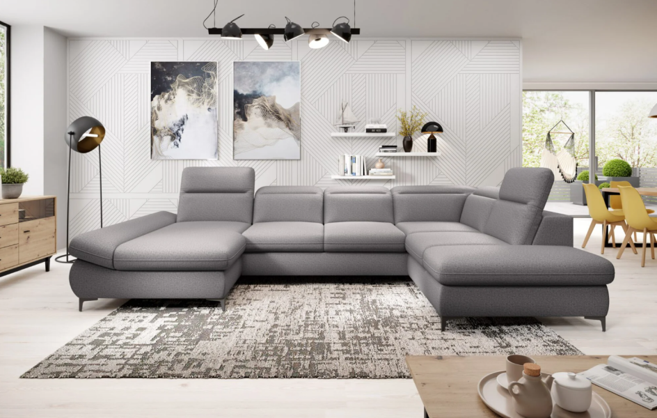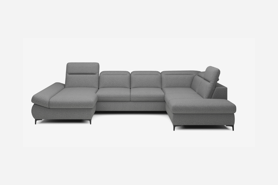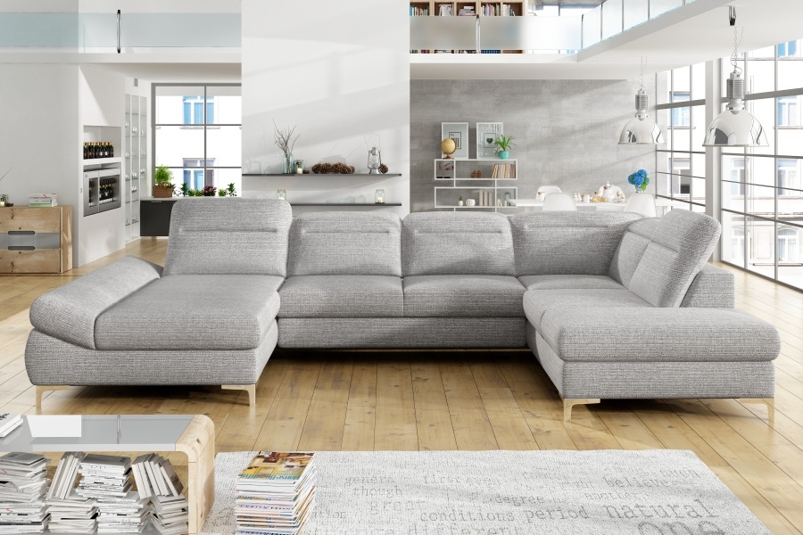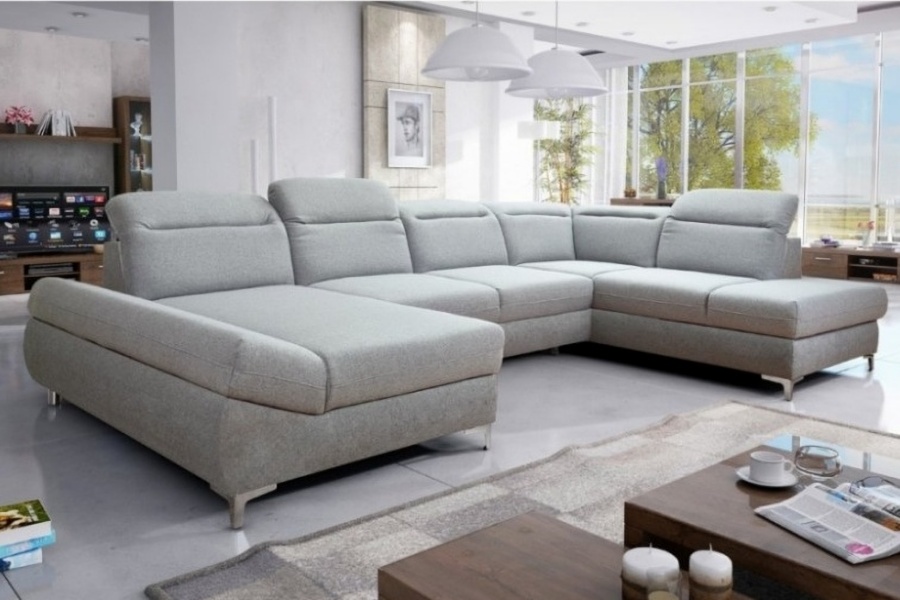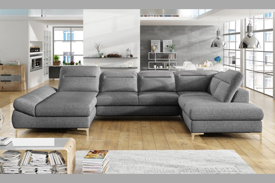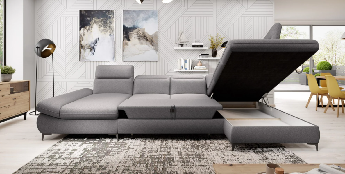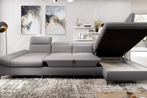 Coltar extensibil TIMOLA XL material textil gri, cu lada pentru depozitare, tetiere reglabile 215x348x175cm