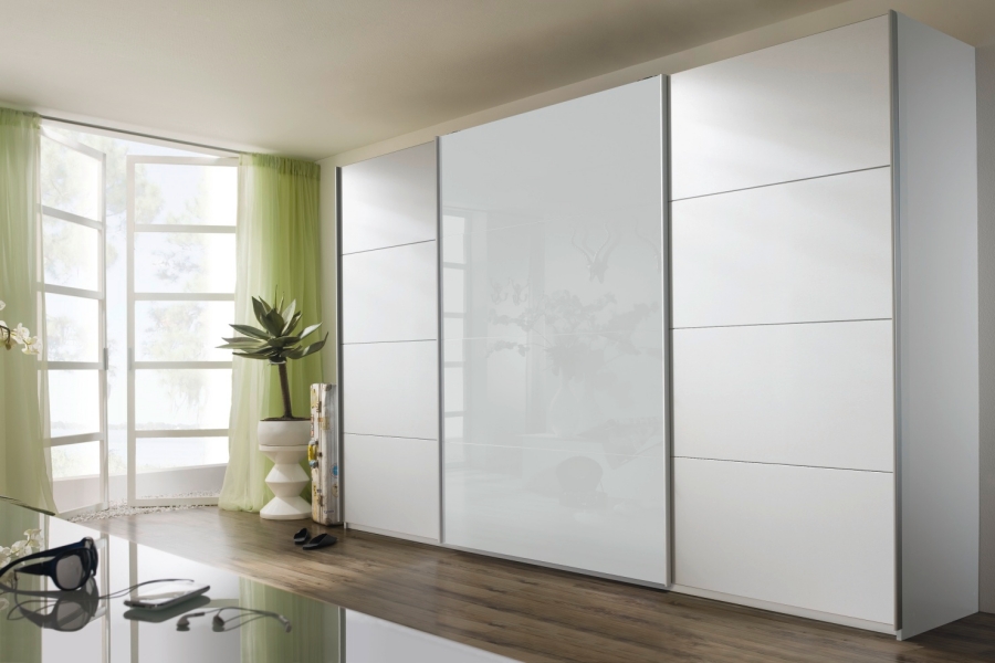 Dulap cu usi glisante KULMBACH 361x229x62cm alb alpin/ sticla alba configurabil