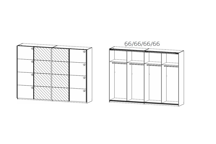 - Dulapul are inclus 2 polite si 1 bara pentru umeras pentru fiecare compartiment, in total 8 polite 66x48cm si 4 bare pentru umerase.