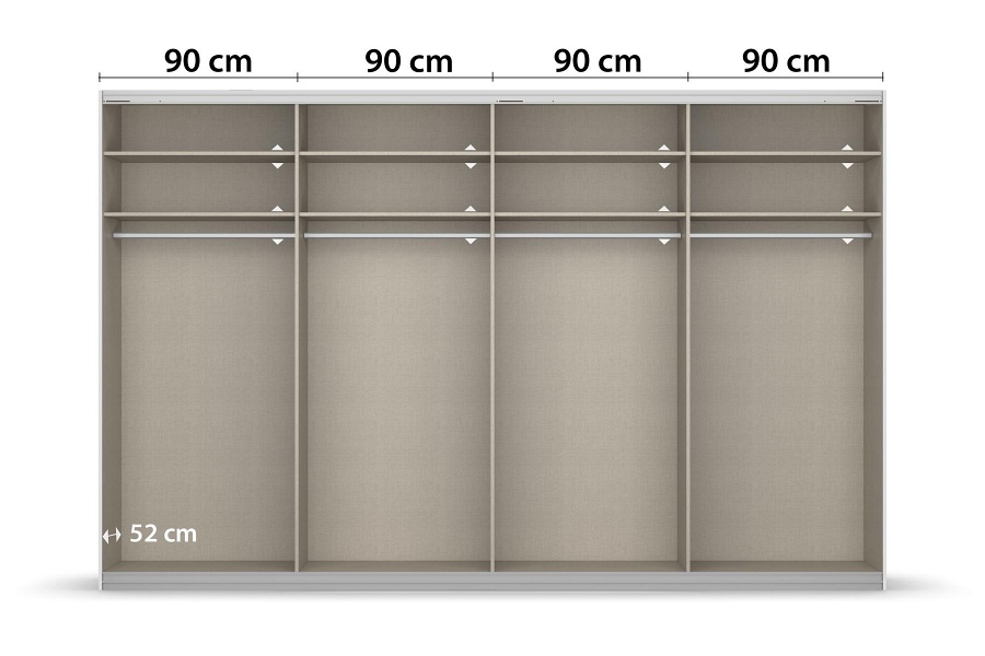 - Dulapul are inclus 2 polite si 1 bara pentru umeras pentru fiecare compartiment, in total 8 polite 88x48cm si 4 bare pentru umerase.
