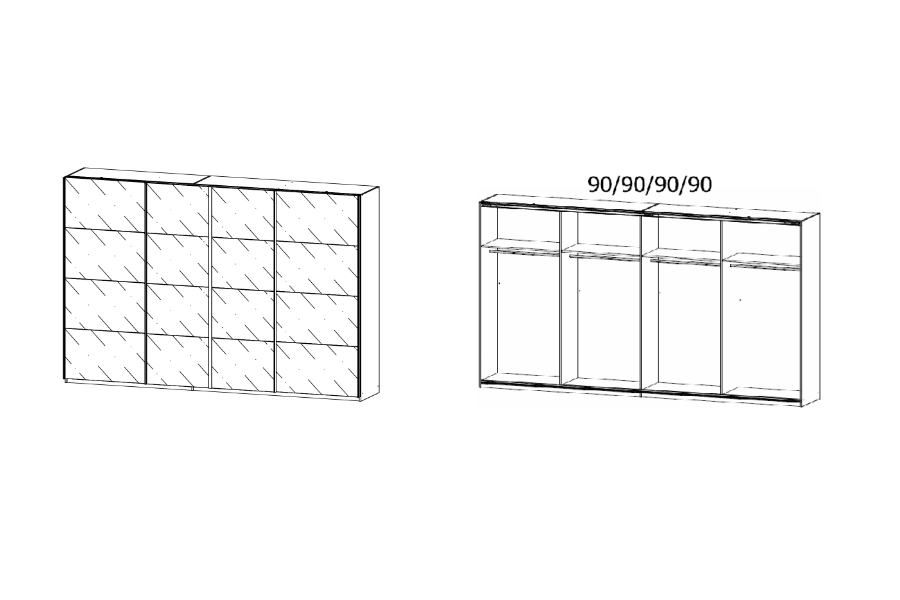 - Pentru compartimentele de 90cm dulapul are inclus 2 polite si 1 bara pentru umeras, in total 6 polite 88x48cm si 3 bare pentru umerase.
