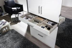 Dulapul poate fi completat cu accesorii inteligente ( sertare, polite, bare pt. umerase, inchidere soft...) care se potrivesc exact nevoilor fiecaruia.