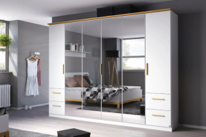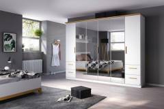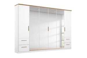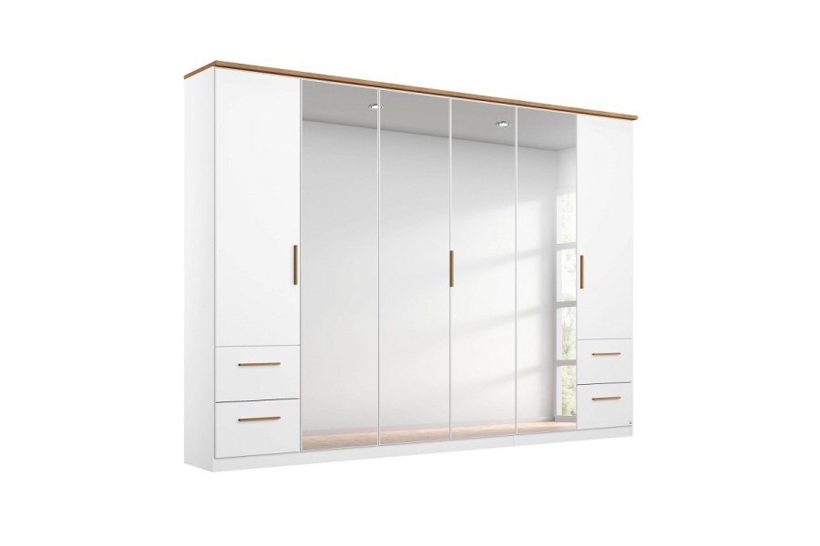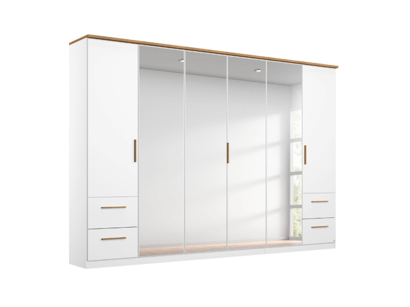 Dulap cu 6 usi cu balamale si 4 sertare CARLSSON 271x212x58cm alb alpin/ oglinda, manere stejar