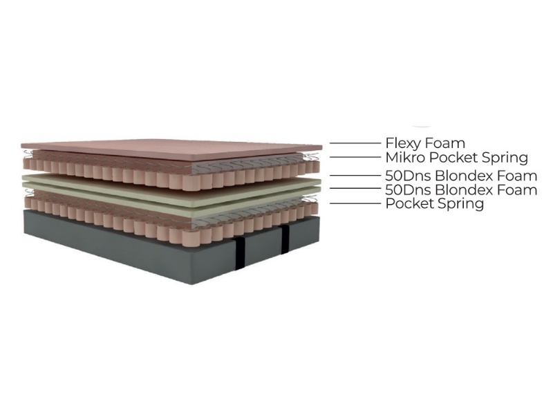 Saltea: Saltea cu arcuri tip (POCKET SPRING + MIKRO POCKET SPRING) + spuma (50DNS BONDEX FOAM + FLEXY FOAM)