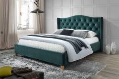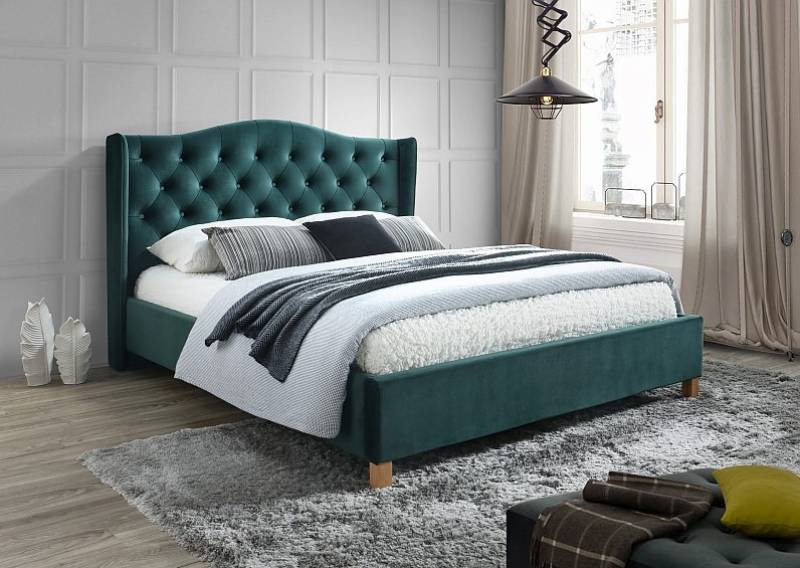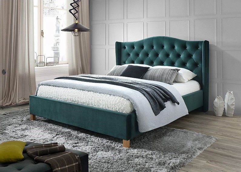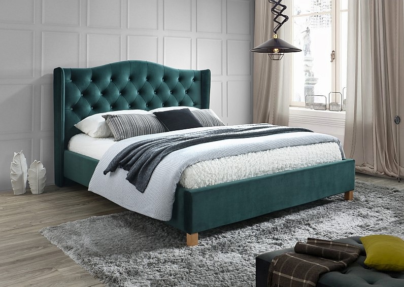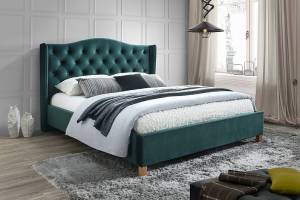 Pat tapitat cu somiera ASPEN VELVET 140/ 160cm catifea green, picioare nuanta lemnului