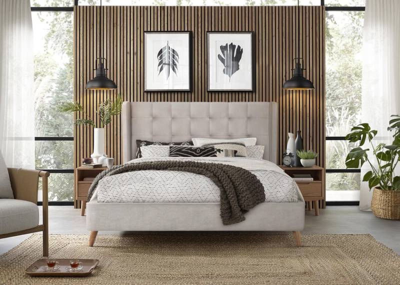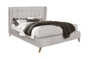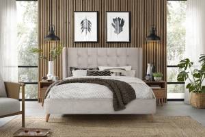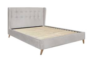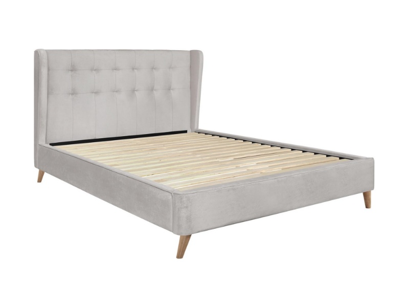 Pat tapitat cu somiera ESTELLA (160x200cm) catifea beige, picioare nuanta lemnului