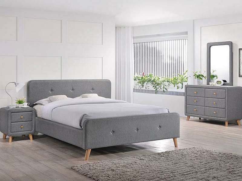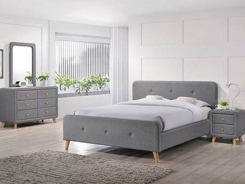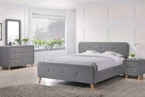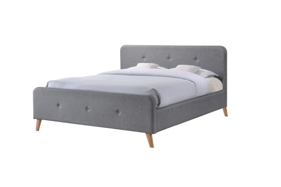 Pat tapitat cu somiera MALMO (160x200cm) material textil grey, picioare nuanta lemnului