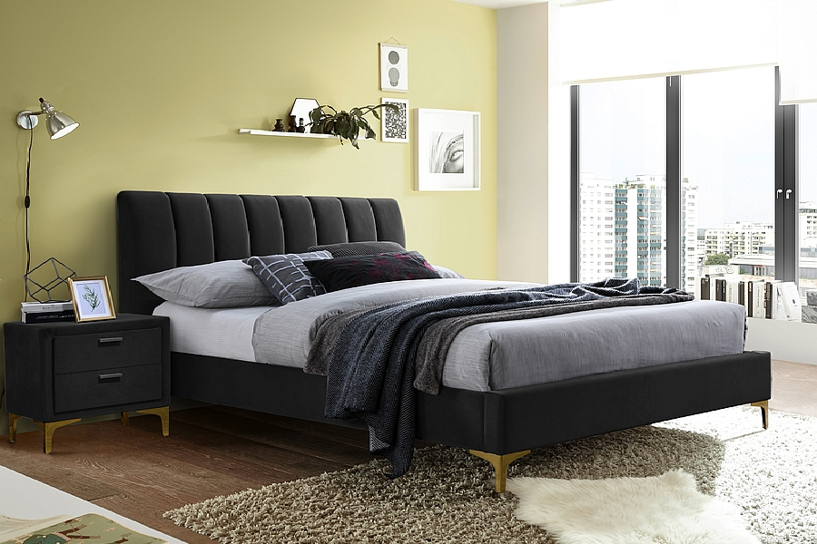 Pat tapitat cu somiera MIRAGE VELVET (160x200cm) catifea black, picioare aurii