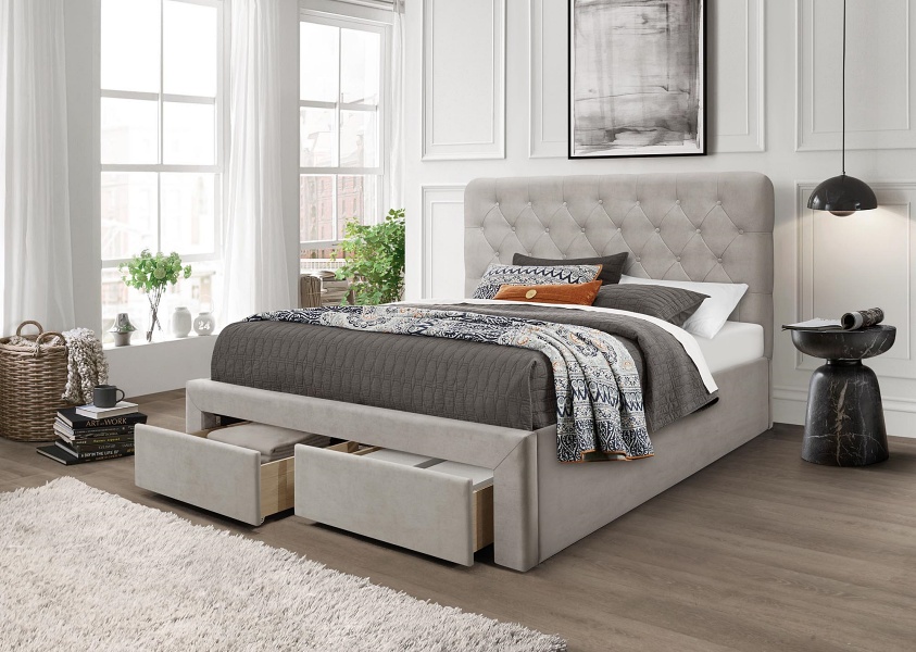 Pat tapitat cu somiera si sertare pentru depozitare MARISOL (160x200cm) catifea beige