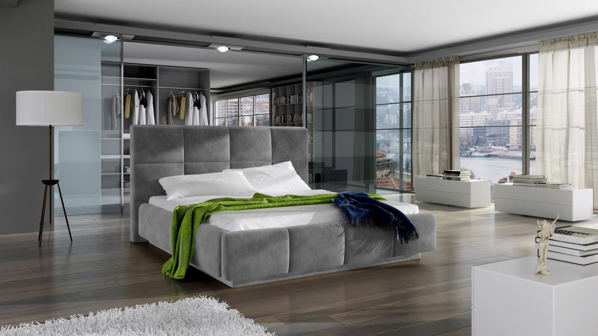 Pat tapitat cu somiera tip placa FOG 140/ 160/ 180cm personalizabil, picioare crom