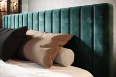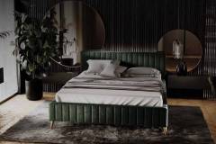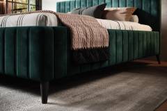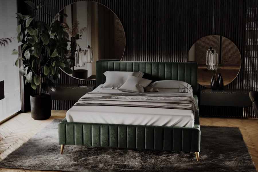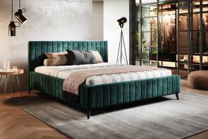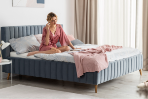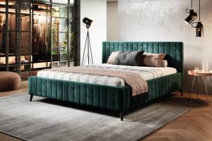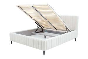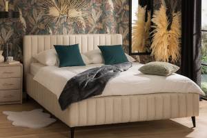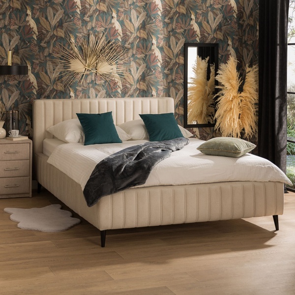 Pat tapitat cu somiera si spatiu pentru depozitare MAGGIE 140/ 160/ 180cm personalizabil, picioare negre/ nuanta lemnului