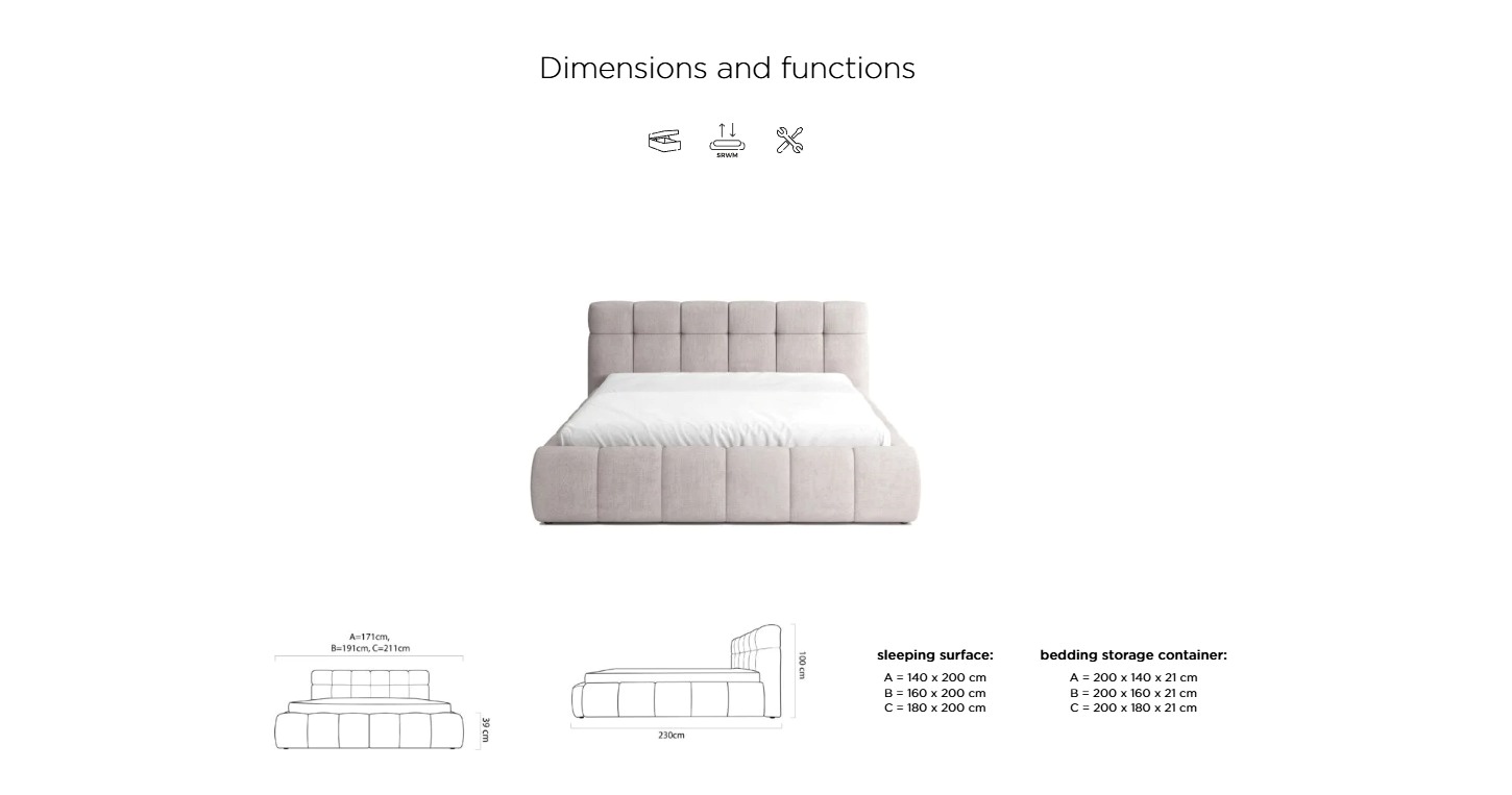 Zona pentru dormit: 140 X 200 cm / 160 X 200 cm / 180 X 200 cm