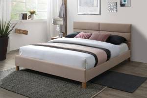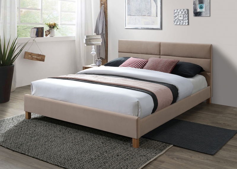 Pat tapitat cu somiera SIERRA VELVET (160x200cm) catifea beige, picioare nuanta lemnului