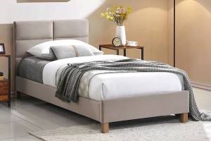 Pat tapitat cu somiera SIERRA VELVET (90x200cm) catifea beige, picioare nuanta lemnului