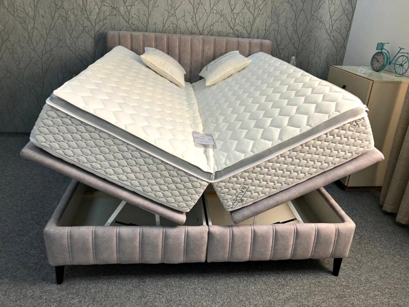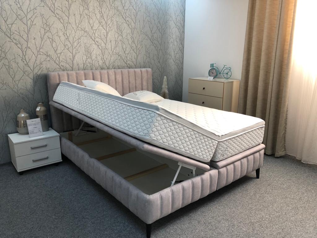 Patul are suport pentru saltea tip placa tapitata, cu sistem de ridicare care faciliteaza accesul la lada pt. depozitare.