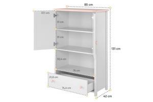 - comoda are 1 sertar si 2 usi cu o polita in interior