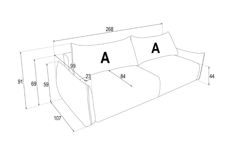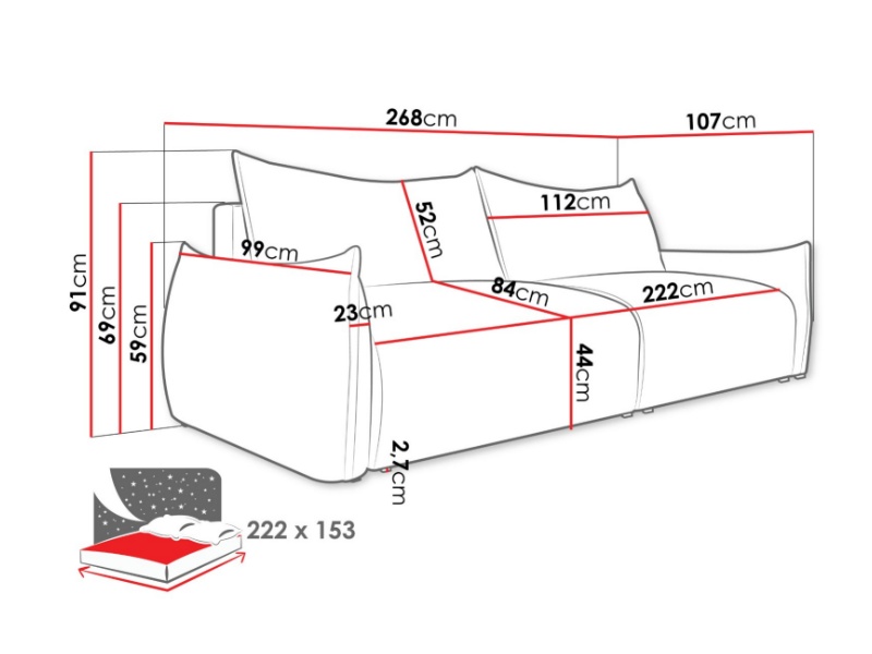 Dimensiunile spatiului de dormit sunt: 222 x 153 cm