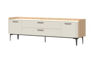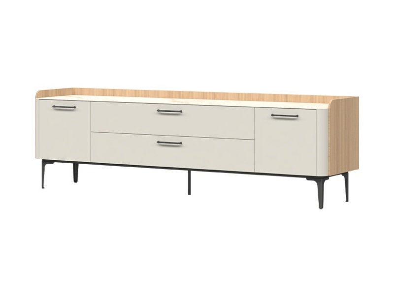 Comoda tv cu 2 usi si 2 sertare AIR 209x63x47cm Pepper White/ stejar Furneo - sticla cu model de marmura Calcatta Oro, cadru, picioare si manere Antracit