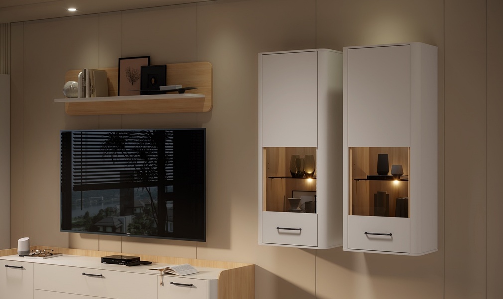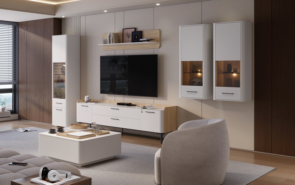 Pretul afisat nu include comoda TV, coprurile suspendate, masuta, montajul, alte piese de mobilier si accesoriile din imaginea de prezentare a produsului.
