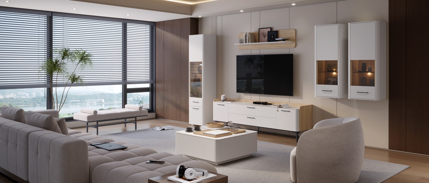 Pretul afisat nu include comoda TV, coprurile suspendate, corpurile suspendate, montajul, alte piese de mobilier si accesoriile din imaginea de prezentare a produsului.
