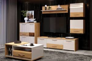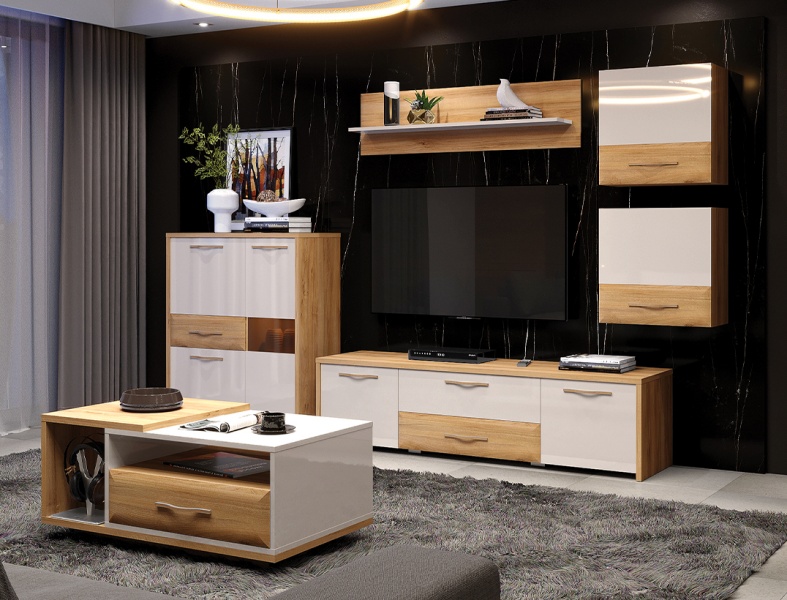 - partea frontală a sertarelor inferioare este din MDF profilat cu folie în decor lemn nuc Pacific