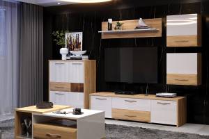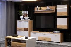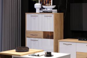 - un sertar si trei usi, sticla, decor bej lucios (lac UV) si nuc Pacific