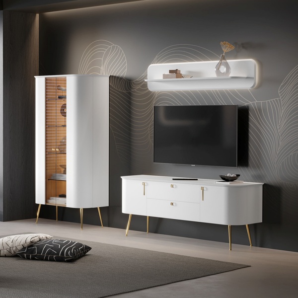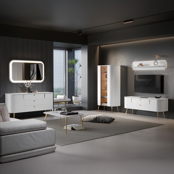 Pretul afisat nu include alimentarea LED, comoda mare, comoda tv, raftul, oglinda, masuta, montajul, alte piese de mobilier si accesoriile din imaginea de prezentare a produsului.