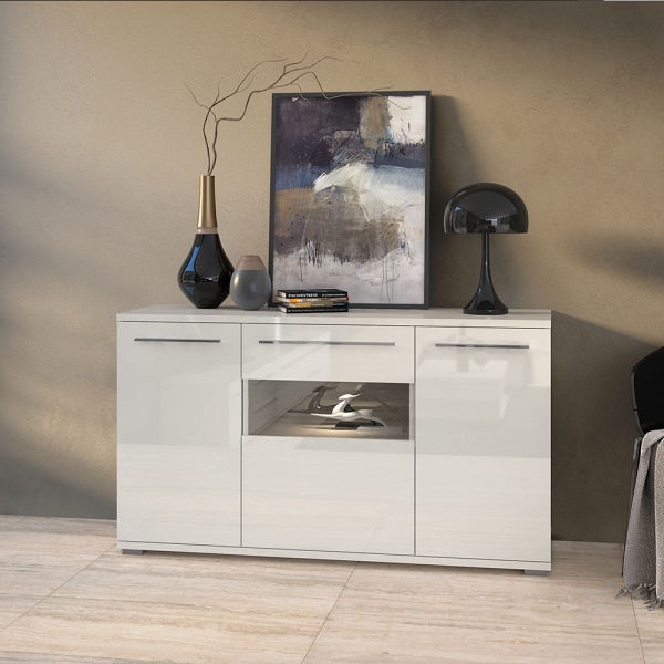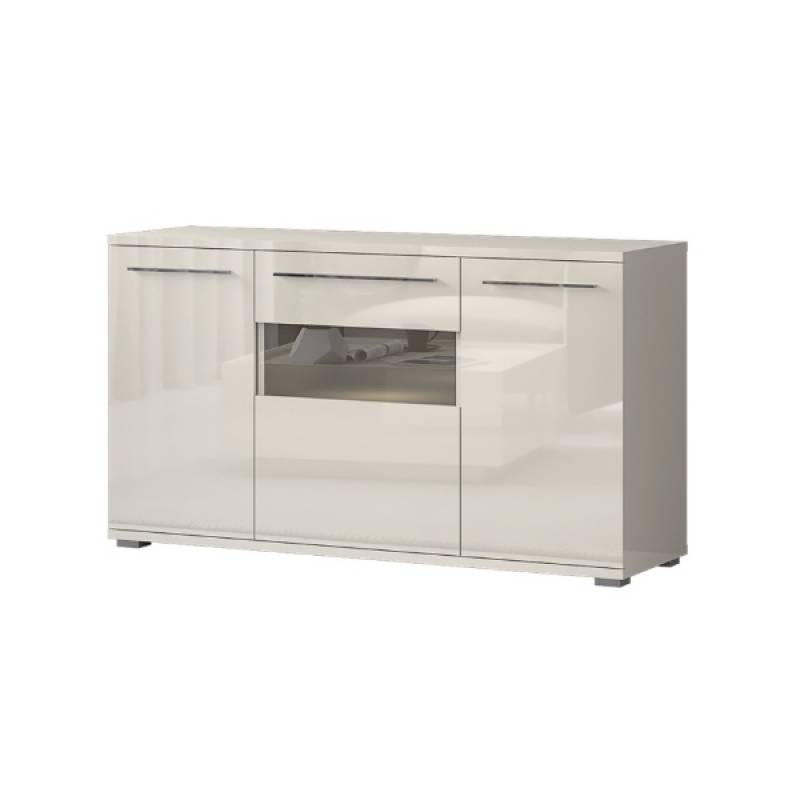 Comoda cu 3 usi cu sticla PIANO BEIGE 150x85x45cm bej lucios - sticla, manere si picioare crom