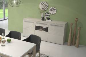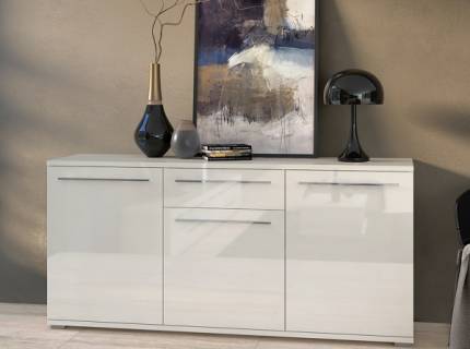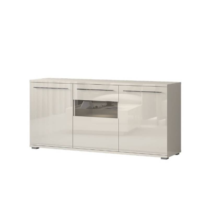 Comoda cu 3 usi cu sticla PIANO BEIGE 180x85x45cm bej lucios - sticla, manere si picioare crom