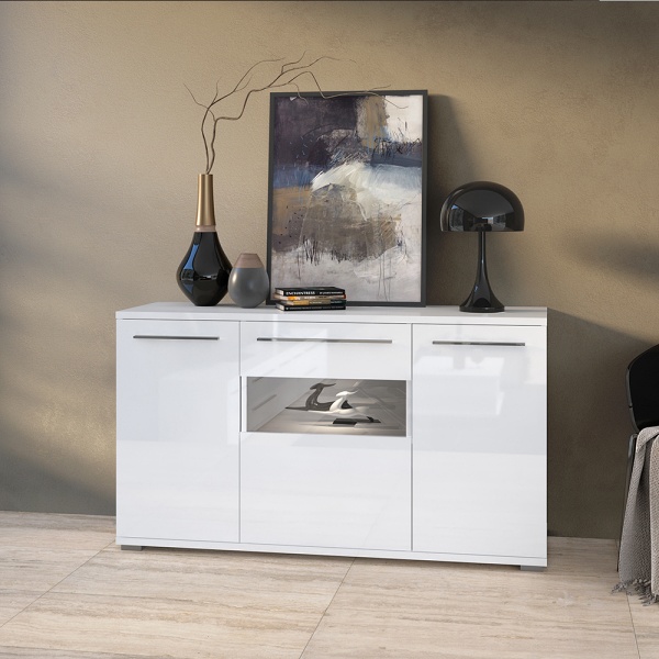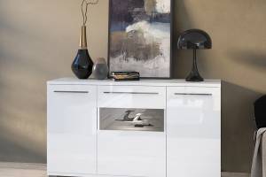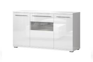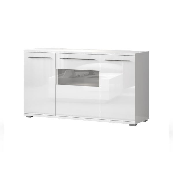 Comoda cu 3 usi cu sticla PIANO WHITE 150x85x45cm alb lucios - sticla, manere si picioare crom