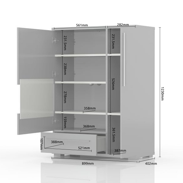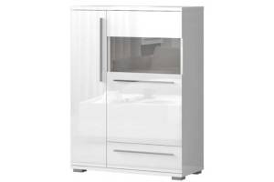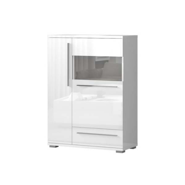 Vitrina lata cu 2 usi cu sticla si 1 sertar PIANO WHITE 90x123x40cm alb lucios - sticla, manere si picioare crom