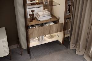- panouri laterale si fund din MFC (30mm - partea vizibila 12mm si partea ascunsa 18mm) vopsit in nuanta casmir
