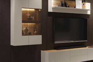 Pretul afisat nu include polita suspendata, comodele tv,comoda din lateral, masuta, montajul, alte piese de mobilier si accesoriile din imaginea de prezentare a produsului.