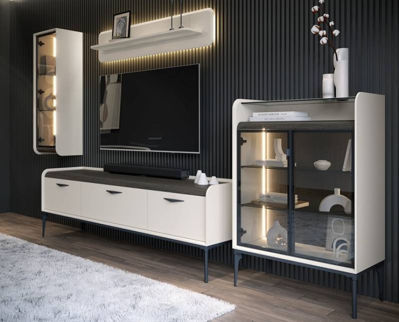 Pretul afisat nu include polita suspendata, comodele tv,comoda din lateral, masuta, montajul, alte piese de mobilier si accesoriile din imaginea de prezentare a produsului.