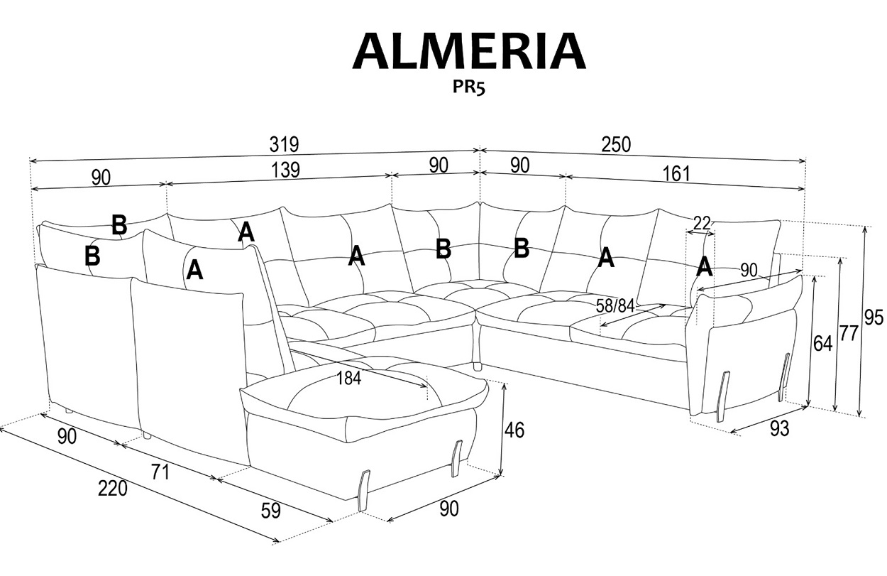 Coltar extensibil ALMERIA 5 cu lada pentru depozitare, personalizabil 250x319x220cm