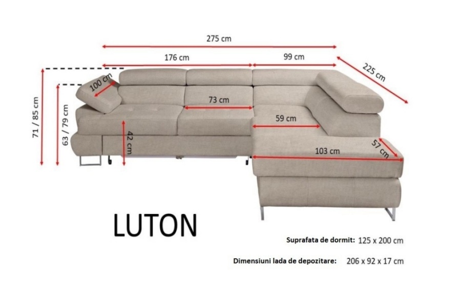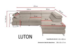 Coltar extensibil LUTON cu lada pentru depozitare, tetiere reglabile, cotiera reglabila, personalizabil 275x225cm